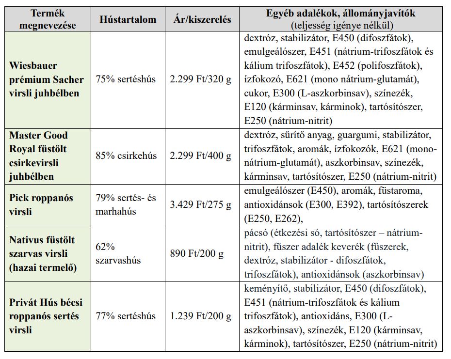 Mivel a boltokban az árat tekintve széles skálán mozognak a virslik – egyes gyártók kilogrammonként akár 7.000-12.000 Ft-ot is elkérnek termékeikért –, példaként megnéztünk néhányat az ár és összetétel szempontjából. Ezért az árért a vásárló talán joggal várhatja, hogy minőségi terméket vesz, ennél a termékcsoportnál azonban úgy tűnik, nincs arányban az ár a minőséggel. A megnézett termékek kivétel nélkül tartalmaznak például nátrium-nitritet, e mellett tele vannak foszfátokkal, ízfokozóval, stabilizátorral, színezékkel.